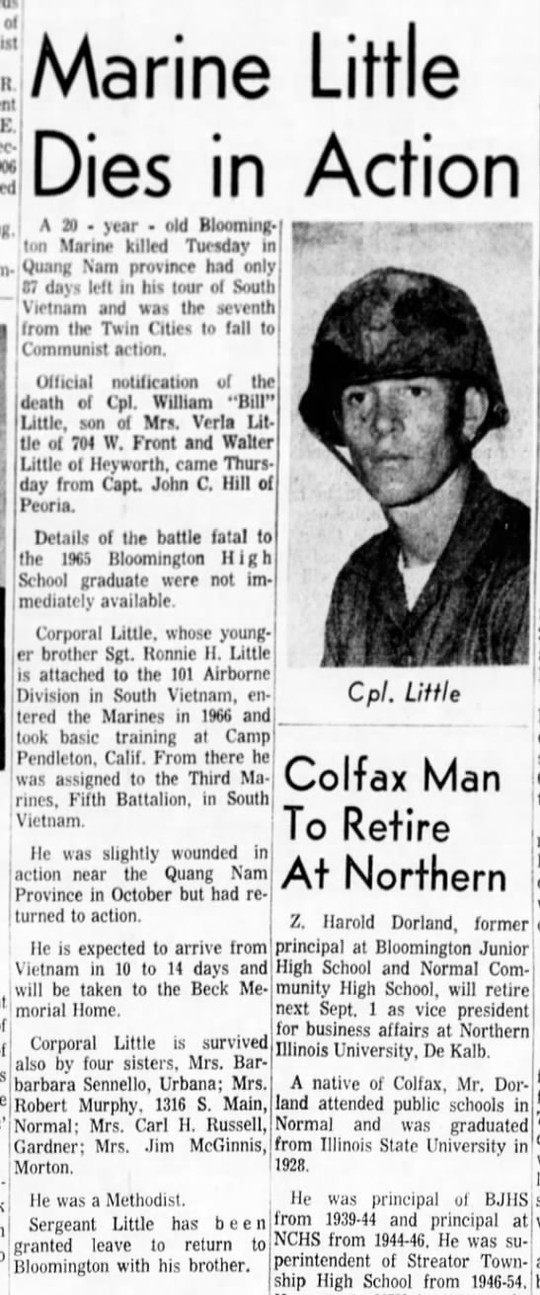 Billie Little died in the line of duty to his country while in Viet Nam after high school. He has a plaque at the Viet Nam Memorial in Miller Park. Sandy Weber Bumpus